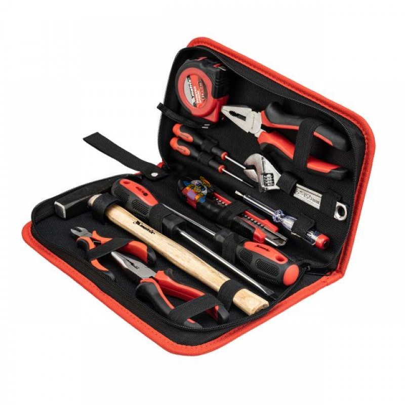 Набор Matrix 13562, 12 предметов, будет полезен как частным мастерам, так и профессионалам для проведения слесарно-монтажных работ. Он включает отвертки для монтажа/демонтажа резьбовых соединений, в том числе и мелких, разводной ключ для болтов и гаек, нож для резки плотных материалов, рулетку для проведения замеров, молоток, кусачки, и тестер напряжения.